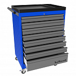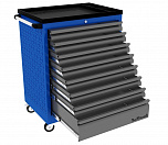 8 ящиков. Для хранения инструмента в ЕВРОЛОЖЕМЕНТАХ. Боковые панели с перфорацией (для установки аксессуаров). Цельносварная конструкция корпуса тележки. Центральный замок Euro-Lock. Шариковые направляющие полного выдвижения. Размеры (высота x ширина x глубина): 850 х 700 х 460 мм. Вес: 66,4 кг.
