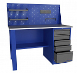 Однотумбовый. Допустимая нагрузка на столешницу 750 кг. Опорные элементы выполнены сварными из холоднокатаной стали. Верстак состоит из столешницы, опоры, тумбы P4 с двумя малыми и двумя большими ящиками и полки-стенки. Все металлические элементы покрыты полиэфирной порошковой краской. Столешница состоит из фанеры марки ФСФ толщиной 24 мм, которая покрыта лаком-антисептиком и листом оцинкованной холоднокатаной стали толщиной 1,2 мм. Размеры (ВхШхГ) 855x1396x696 мм.