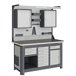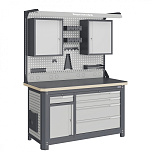 Нагрузка на столешницу 1500 кг. Столешница из листа влагостойкой фанеры марки ФСФ толщиной 40 мм и листом горячекатаной стали толщиной 5 мм. Рама верстака выполнена их холоднокатаной стали. Модуль верстака выполнен сварными. Ящики в модулях устанавливаются на шариковых телескопических направляющих полного выдвижения. Квадратная перфорация для установки крючков, держателей. Размеры: 1982x1493x743 мм.