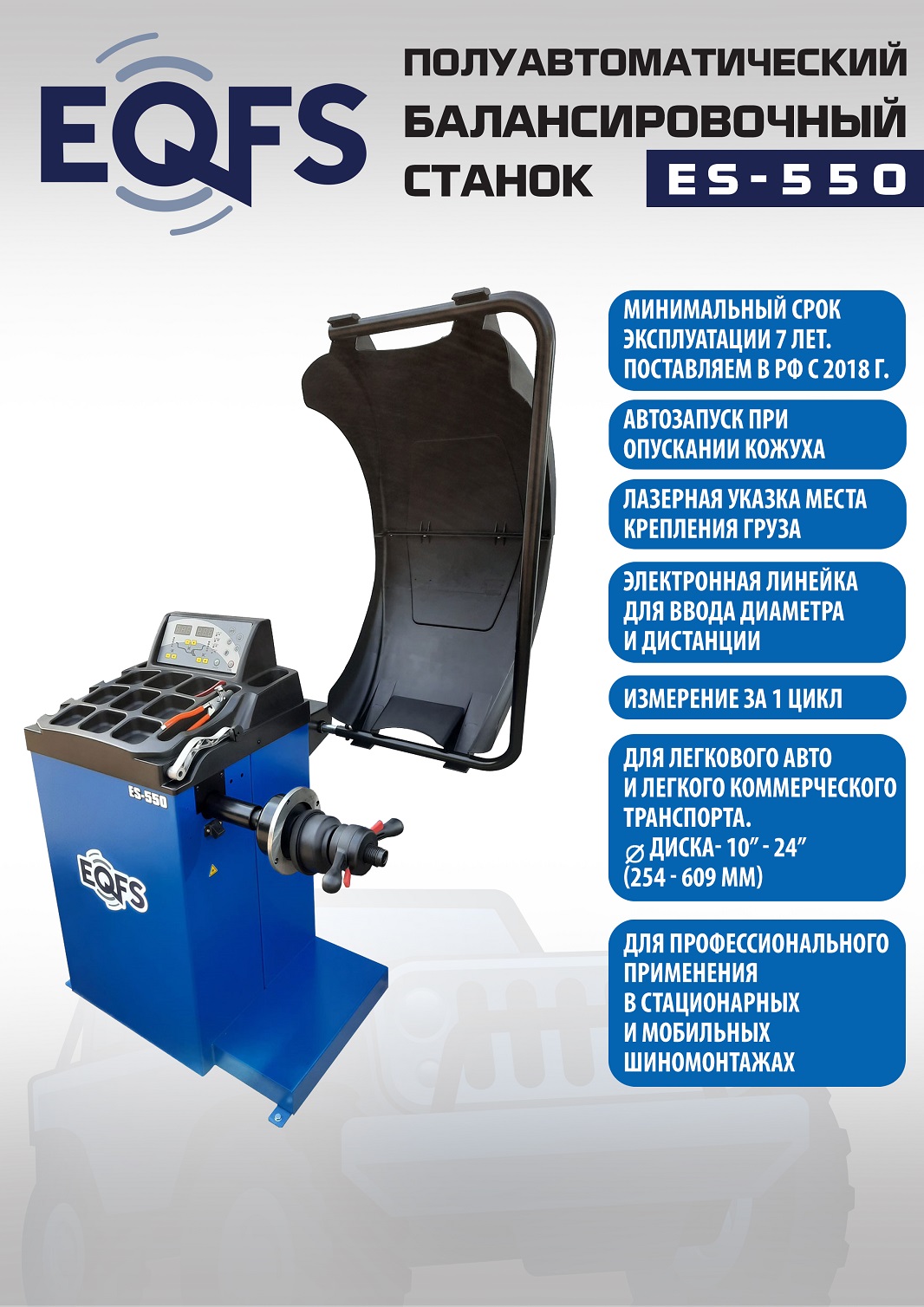 + ES-550 Балансировочный станок. Полуавтомат. Удобный и понятный интерфейс. Автозапуск опусканием кожуха. Автоматический ввод дистанции и диаметра диска. Лазерная навигация. Автокалибровка. Для колес легковых автомобилей, мотоциклов, «Газелей», «Спринтеров» с диаметром диска с резиной до 800 мм. Размеры диска: ширина 3–10” (76-254 мм), диаметр диска 10–24” (254÷609 мм). Вес ≤ 65 кг. Вал- 36 мм. Точность ±1гр. 220 В. Режимы работы DINAMIC, STATIC, ALU1, ALU2, ALU3, ALUS, ST. Гарантия 12 мес. В комплекте: кожух с автозапуском + клещи + кронциркуль + быстрозажимная гайка + набор конусов.