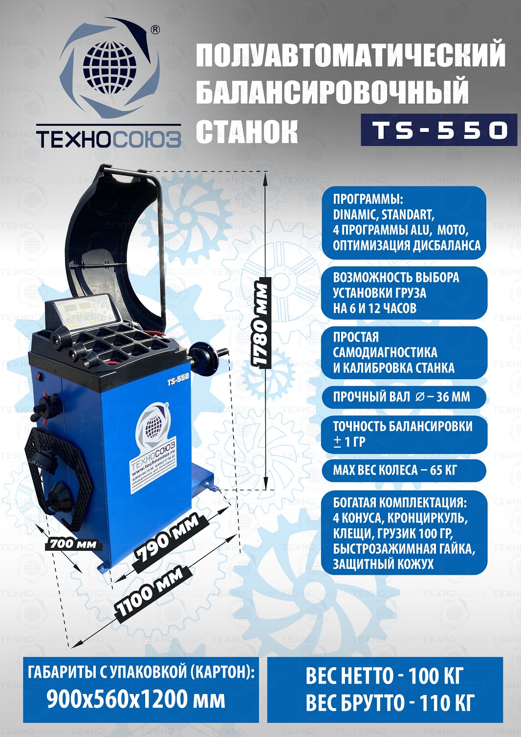 + TS-550 Балансировочный станок (с лазером) Полуавтомат. Удобный и понятный интерфейс. Автозапуск опусканием кожуха. Автоматический ввод дистанции и диаметра диска. Лазерная навигация. Автокалибровка. Для колес легковых автомобилей, мотоциклов, «Газелей», «Спринтеров» с диаметром диска с резиной до 800 мм. Размеры диска: ширина 3–10” (76-254 мм), диаметр диска 10–24” (254÷609 мм). Вес ≤ 65 кг. Вал- 36 мм. Точность ±1гр. 220 В. Режимы работы DINAMIC, STATIC, ALU1, ALU2, ALU3, ALUS, ST. Гарантия 12 мес. В комплекте: кожух с автозапуском + клещи + кронциркуль + быстрозажимная гайка + набор конусов.