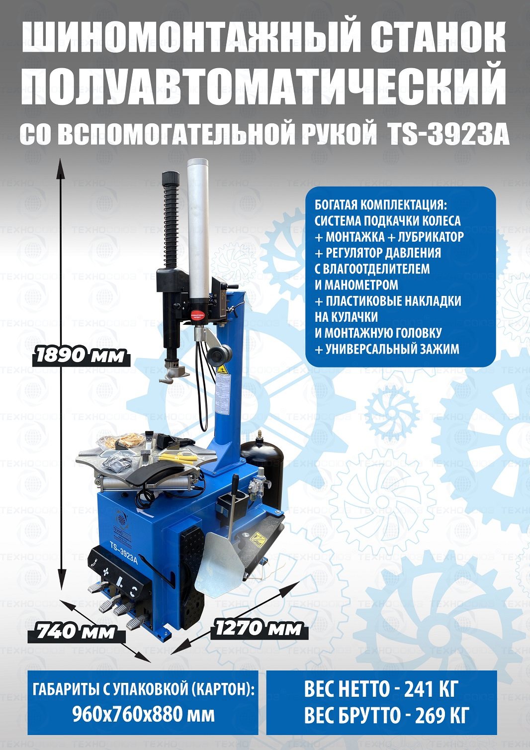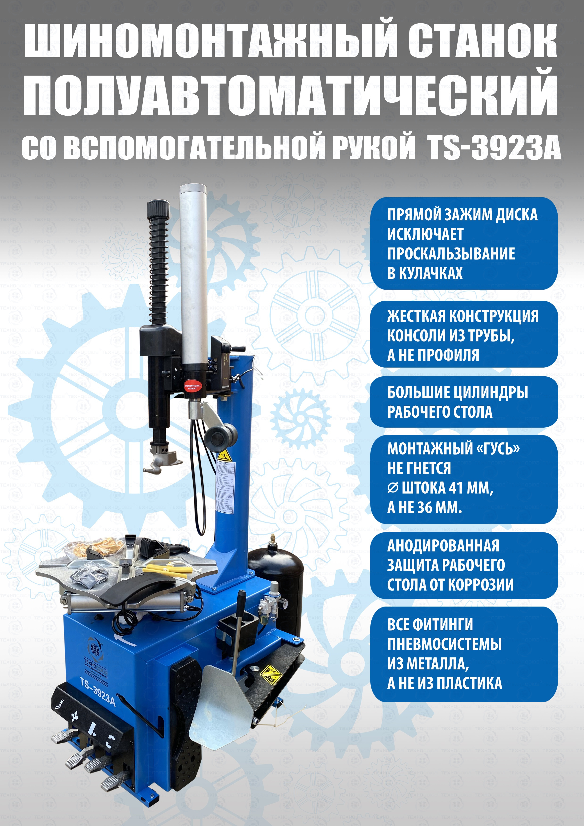 Шиномонтажного станка TS-3923A Для больших и широких колес с встроенным увеличенным бустером емкостью 24 литра (взрывная подкачка) + дополнительной вспомогательной рукой для работы с низкопрофильными шинами и RanFlat! Для колес 12-24” Напряжение 220В/380В. В комплекте: пистолет для подкачки шин + монтажка + регулятор давления с влагоотделителем и манометром. Напряжение 220В/380В