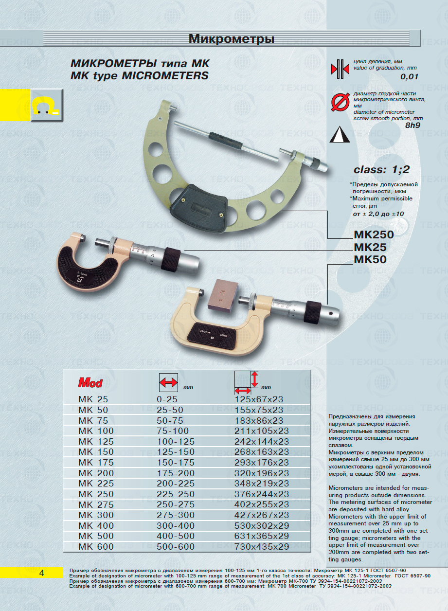 Цена деления 0,01 мм. Диапазон измерения от 225-250 мм. Для измерения наружных размеров изделий. Измерительные поверхности микрометра оснащены твердым сплавом. Микрометры укомплектованы одной установочной мерой. Класса точности 2. ГОСТ 6507-90. Поставляется в двух вариантах с поверкой и без поверки!