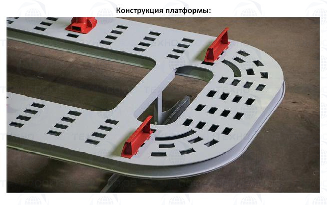 Вдоль всей платформы проходят два ряда пазов для крепления в них фиксирующих стоек, благодаря которым можно закрепить кузов любой конструкции. Платформа имеет выступающие кромки на внешних и внутренних гранях, которые служат рельсовыми опорами для силовых башен. Процедура установки/ снятия автомобиля быстрая и простая. Стапель оснащен гидроцилиндром наклона для заезда .Стапель не требует центровки автомобиля относительно оси рамы,