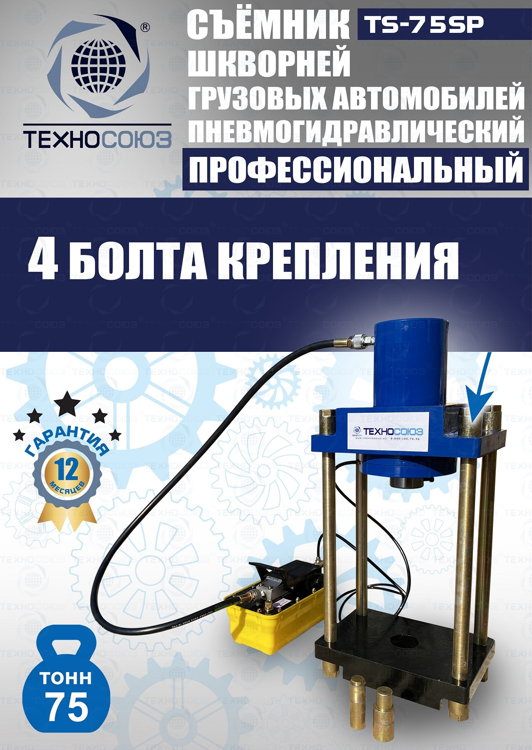 Сокращает время ремонта. Позволяет работать под разными углами. Для выпрессовки шкворней из поворотной цапфы погрузчиков, тракторов, строительной техники, коммерческих и грузовых авто отечественного и импортного производства: MAN, MERCEDES, SCANIA, VOLVO, Корейские и Китайские авто. Пневмогидравлический привод. Рабочее окно 400x320 мм. Усилие 75 тонн.