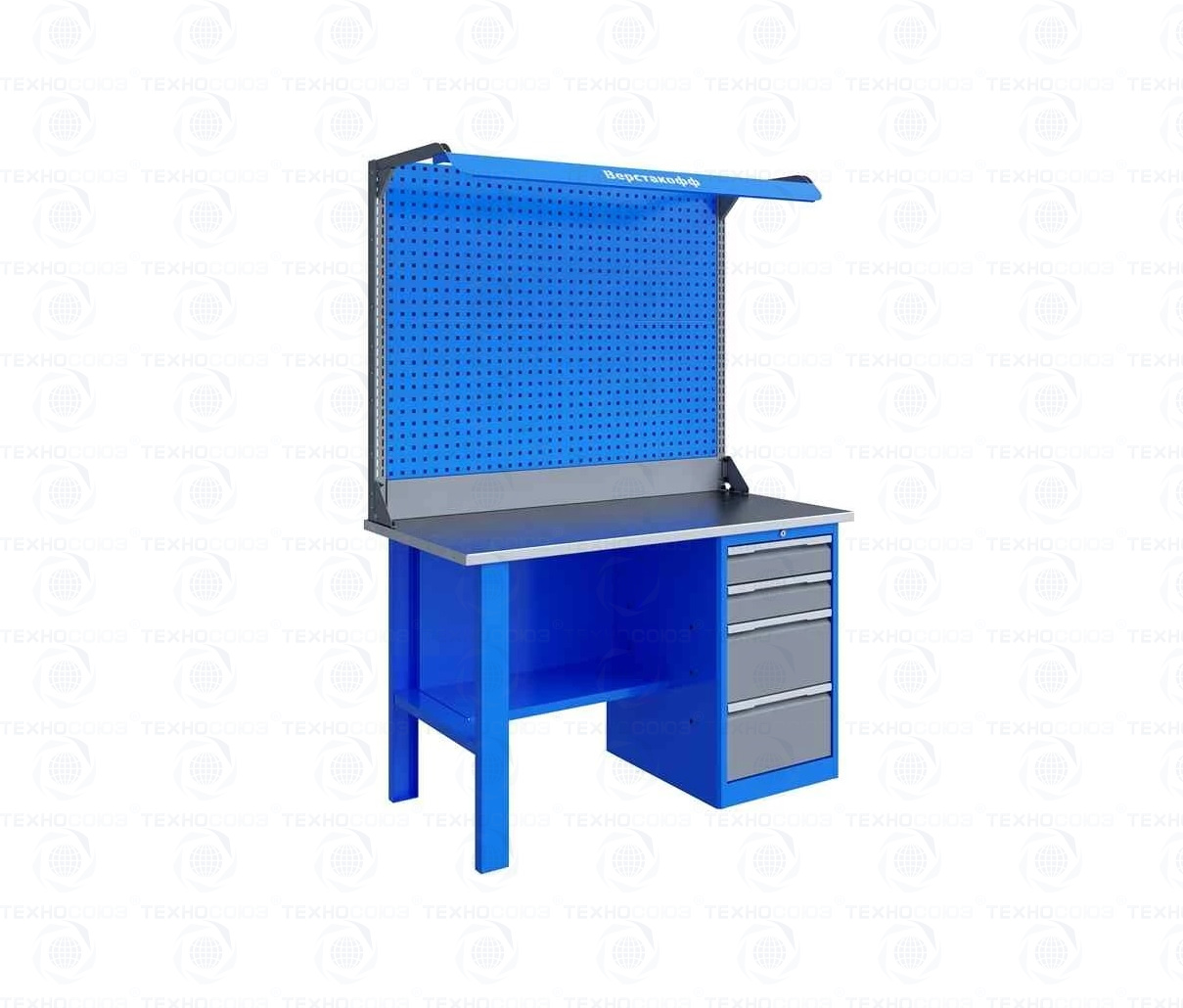 Однотумбовый. Допустимая нагрузка на столешницу 750 кг. Опорные элементы выполнены сварными из холоднокатаной стали. Верстак состоит из столешницы, опоры, тумбы P4 с двумя малыми и двумя большими ящиками, полки-стенки, двойного экрана с кронштейнами и комплекта освещения. Столешница состоит из фанеры марки ФСФ толщиной 24 мм, которая покрыта лаком-антисептиком и листом оцинкованной холоднокатаной стали толщиной 1,2 мм. Размеры (ВхШхГ) 1965x1396x696 мм.