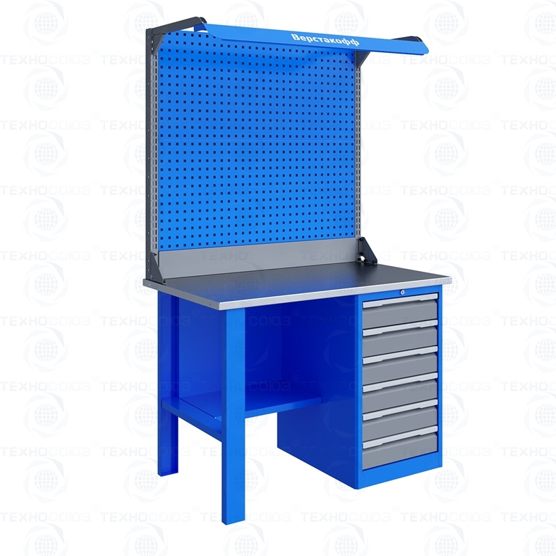 Однотумбовый. Допустимая нагрузка на столешницу 750 кг. Опорные элементы выполнены сварными из холоднокатаной стали. Для выполнения сборочных, ремонтных, слесарных, монтажных и других видов работ на производстве, в сервисных центрах, мастерских, гаражах, а также для обучения технологии в учебных заведениях. Комплектуется полкой-стенкой, расположенной под столешницей для удобного размещения габаритного инструмента и оснастки. Размеры верстака: 855x1196x696 мм. Вес: 78 кг. Поставляется в 4 комплектациях на выбор.